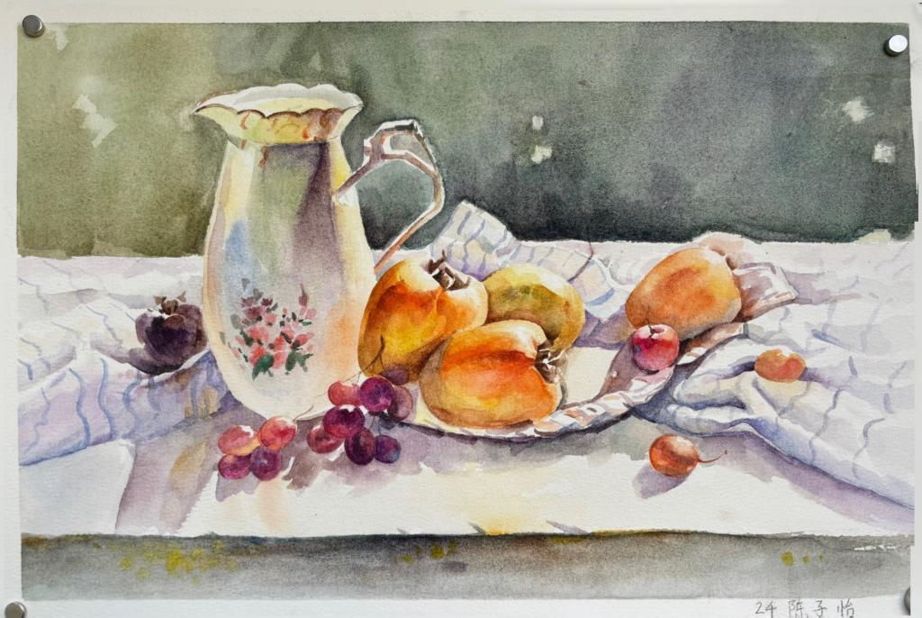 本次展出的作品,聚焦水彩风景画与静物画两大核心品类,题材丰富而鲜活:静物系列中,饱满的水果凝萃着生活的甜润,盛放的花卉流转着自然的芬芳;风景系列则铺展出错落有致的天地长卷,每一幅作品都凝聚着学子们对自然万象的细腻观察与深刻共情。