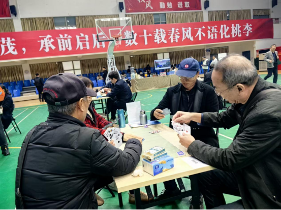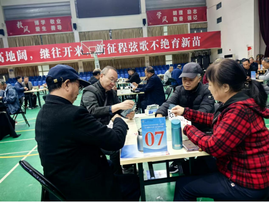 比赛现场,气氛紧张而热烈。我校四位退休教师沉着应战,默契配合,在牌桌上展现出了丰富的比赛经验和精湛的牌技。他们时而凝神思考,时而果断出牌,充分展现了师者风范和智慧光芒。经过多轮激烈角逐,最终脱颖而出,为学校赢得了荣誉。