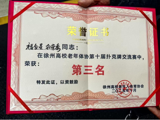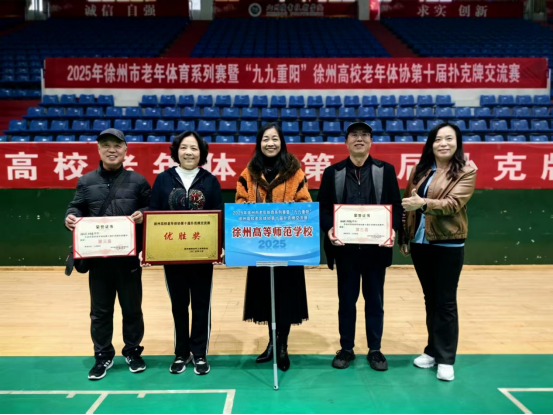 10月25日,正值第16个全国"敬老月",2025年徐州市老年体育系列赛暨"九九重阳"徐州高校老年体协第十届扑克牌交流赛在九州职业技术学院文体馆成功举办。我校退休教师陈家鸿、李素芳、禇金星、孙崇秀四位老师组成两支代表队参赛,凭借出色表现荣获团体优胜奖,其中禇金星、孙崇秀老师组合更斩获个人第三名的优异成绩。
