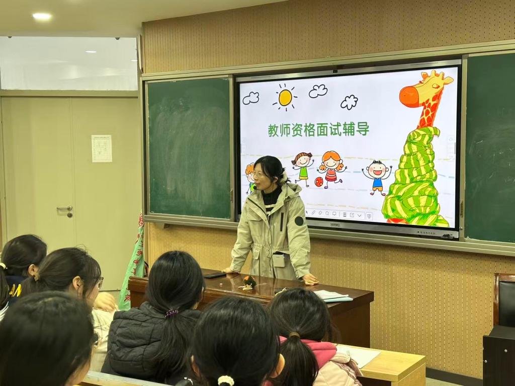 为迎接12月6-7日教师资格考试(面试),学前教育系于2025年11月26日下午组织22级通过笔试的140名学生进行模拟面试。11月19日下午,学前系孔繁晶副主任开设专题辅导讲座,对面试流程进行全方位的讲解,并整合以往面试中出现的问题开展针对性辅导,以帮助学生迅速找准定位,迎接面试。